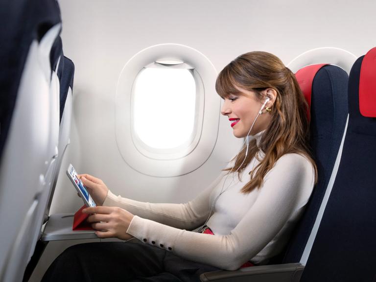 Benefit from a new, more elegant and comfortable leather seat that will gradually be made available on all our A319 and A320 aircraft. The adjustable headrest is covered in red leather, symbolizing the spirit of Air France. Make yourself comfortable: the armrests can be raised fully into the seat back and you receive a soft pillow. And on longer flights,* we provide you with an elegant travel kit containing a sleep mask and basic toiletries.
